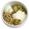 Теперь соединяем в одной миске яйца, лук (отжать) мясо, чернослив. Добавляем майонеза в салат и размешиваем его.