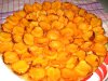 Форму смазать маслом, достать тесто и выложить его в форму. Можно раскатать, а можно просто отрывать по кусочку теста и выкладывать в форму, там расплющить его. Стенки тоже выложить тестом. Положить на тесто фрукты выпуклой стороной вниз и залить соусом. Выпекать пирог 40 минут на среднем огне.