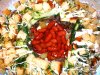 Курицу подготовить как для жарки. Натереть солью и перцем, приправами. Выложить ее на застеленный бумагой противень, по желанию можно обмазать майонезом или кетчупом. Вокруг курицы разложить фаршированный картофель. Поставить в горячую духовку примерно на один час. Время приготовления зависит от величины курицы. Достать противень из духовки, проткнуть курицу в нескольких местах. Если сок выделяется прозрачный – она готова и можно подавать к столу.