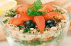 В красивый салатник выкладываем салатик с палтусом (горкой). Сверху ставим попку от яйца и внутрь накладываем немного икры. Украшаем салатик оливками нарезанными колечками.