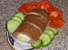Отрезать кусок пищевой пленки (если нет, то подойдет полиэтиленовый пакет), разложить на нем тонким слоем мясной фарш. Мокрыми руками разровнять его и сформировать прямоугольник. На середину фарша по всей длине выложить зелень, на нее – шампиньоны, сверху посыпать тертым сыром. Приподнять края пленки вместе с фаршем и соединить. Получившийся рулет обжать со всех сторон, придать ему форму и осторожно перекатить из пленки в противень (его смазать растительным маслом). Уложить рулет швом вниз. Верх смазать взбитым яйцом и посыпать панировочными сухарями. Проткнуть рулет в нескольких местах ножом. Запекать 35 – 40 минут при температуре 200 градусов.