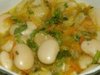 Овощи порезать, сложить в кастрюлю, залить водой, добавить лавровый лист, соль, перец по вкусу. Отдельно порезать лук, обжарить его на оливковом масле и добавить в кастрюлю. Поставить на сильный огонь и дать покипеть 10 минут, после чего огонь убавить и варить до готовности.