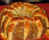 Разложить на фарш кусочки сливочного масла, запекать в горячей духовке при температуре 200 градусов примерно 30 минут. Незадолго до готовности разложить на кольце кусочки сыра и запекать пока сыр не расплавится. Готовое кольцо переложить на блюдо, в середину выложить заранее отваренный рис и поджаренные овощи.
