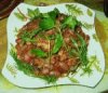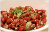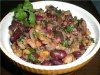 Затем мелко нарежьте репчатый лук, зелень(кинзу, петрушку, укроп), растолките грецкие орехи с чесноком. Потом приправьте фасоль красным перцем и солью, соедините с зеленью, луком и грецкими орехами, прокипятите ещё в течении 2-3 минут и охладите.