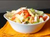 Нужно взять три ломтика ананаса, два средних яблока, гроздь винограда, два банана, 0,5 стакана сгущенного молока или сливочного крема, 0,5 стакана майонеза и листья салата. Фрукты порезать ломтиками или кубиками, добавить ягоды винограда, смешать майонез со сгущенкой или кремом, добавить к фруктам и аккуратно перемешать. На блюдо положить листья салата, а на него охлажденный фруктовый салат.