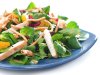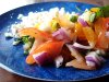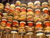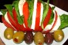 В таком необычном исполнении можно предложить гостям овощной салат. Основное неудобство салатов из свежих овощей – сок, который быстро превращает салат в подобие супа и теряется внешний вид, да и вкус уже не тот. А тут – все те же овощи, да еще в аппетитном сочетании с колбасками и маслинами. Сочетание продуктов не критично. Можно подобрать их по своему вкусу или сделать разные варианты. Например, если к овощам добавить кусочки брынзы, то получится греческий салат на шпажках. Подойдут кусочки обжаренных сосисок или кусочки мяса, отварной птицы. Все овощи режутся крупными кусочками, маленькие помидорки оставляются целыми или разрезаются на половинки. Лук – кружочками, на колечки его разбирать не нужно. На шпажку нанизываются продукты в произвольном сочетании или можно использовать сочетание цветов или продуктов – например, брынза и помидорка или лук и мясо.