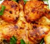 Замечательное праздничное блюдо, которое приятно подать к столу. На большое блюдо необходимо выложить красиво зажаренные целые тушки цыплят, жареные баклажаны и болгарские перцы разных цветов, а также свежие и жареные помидоры, и все это великолепие украсить колечками репчатого лука и зелени. Ингредиенты, рассчитанные на одного цыпленка: