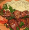 Приготовление: говяжью вырезку нарезают на небольшие куски, складывают в миску, пересыпают мелко рубленным луком и молотым перцем. Сбрызгивают все уксусом, накрывают крышкой и ставят в холодильник на 2 – 3 часа для маринования. После того, как мясо замаринуется, его освобождают от лука, нанизывают на специально подготовленные палочки по 8 кусочков мяса, посыпают их мукой и кладут на сковороду на раскаленное масло. Обжаривают со всех сторон, переворачивая палочки с мясом на сковороде, чтобы образовалась равномерная румяная корочка. Внутри шашлык должен быть розовым.