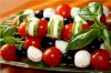 Порционный салат выглядит очень эффектно и красочно, и можете не сомневаться в том, что исчезнет со стола он одним из первых. Такое сочетание продуктов многим придется по вкусу, а оригинальный способ подачи тем более не оставит салат без внимания.Количество продуктов зависит от количества помидоров. Понадобятся листочки свежего базилика, соль, оливковое масло, смесь из разных перцев (молотых), маслины и оливки. Сыр подбирайте по своему вкусу – молодая брынза (овечья или коровья), сулугуни, моцарелла, сыр фета – любой мягкий сыр. Помидоры постарайтесь взять крупные, спелые, мясистые. Для украшения понадобятся листья зеленого салата.