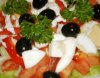 Шампиньоны, язык, томаты, персики, перец болгарский сладкий, майонез, салат.