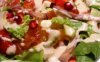 Этот салат готовится в индивидуальных салатниках. В число ингредиентов входят: шампиньоны, помидоры, язык, перец сладкий болгарский, персики и майонез. Получается очень вкусный салат под названием «Изысканный».Ингредиенты: