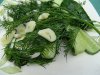 Затем в чистую банку кладём укроп, очищенный чеснок, кладём листочки вишни и смородины. Сверху кладём огурцы.