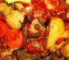 Картофель нужно очистить и порезать на кусочки. Лук почистить и порезать колечками или полукольцами. Помидоры тоже надо промыть и нарезать мелкими кубиками.