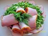Теперь на блин намазываем наш соус, сверху тонкие кусочки горбуши копчёной. Всё это сворачиваем в рулет и ставим на пропитку в холодильник.