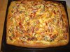 Смешайте сыпучие ингредиенты для теста, добавьте растопленный маргарин и теплое молоко, хорошо все перемешайте, оставьте в теплом месте на час — полтора, дайте тесту хорошо подойти. Нарежьте лук полукольцами и поджарьте до золотистого цвета на любом растительном масле. Сыр потрите на терке, бекон порежьте тонкими полосками. Расстелите на столе фольгу и раскатайте на ней тесто. Оставьте минут на десять.