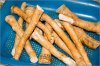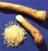 2. Хрен очистить и порезать на кусочки. Потом также необходимо перемолоть на мясорубке. Чтобы легче и удобнее было перемалывать хрен. Надо на мясорубку надеть целый пакет и закрепить его с помощью резинки. Затем после того как хрен будет перекручен надо аккуратно снять пакет с перетертым хреном и переложить к томатам.
