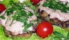 В блюдо выкладываем кусочками нарезанный язык, горошек консервированный, остывшую спаржу, перемешиваем.