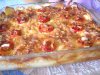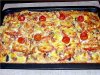 Тем временем режем помидоры кружочками, колбасу или ветчину, курицу – небольшими кусочками, натираем на терке сыр. Укладываем основу для пиццы на противень (его лучше не смазывать, а застелить бумагой для выпечки), на нее распределяем начинку. Вниз (на картошку) положим помидоры, их чуть присаливаем и перчим. Затем колбаса или грибы, курица и все засыпаем тертым сыром. Выпекаем в духовке на среднем огне минут пятнадцать.