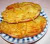 Лук мелко режем и обжариваем в растительном масле до румяного цвета. Картофель натираем на крупной терке, добавляем соль и перец, слегка взбитые яйца и обжаренный лук. Быстро перемешиваем, выливаем тесто на сковородку и на среднем огне обжариваем сначала одну сторону, затем переворачиваем и подрумяниваем вторую. Снимаем картофельную лепешку со сковородки, даем немного остыть.