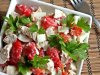 Салатик понравится тем кто любит быструю и легкую закуску с недолгими застольями. Его можно делать и в салатнике – просто смешать все ингредиенты или подавать в лодочках из болгарского перца. Что понадобится из продуктов (пропорции произвольные)