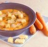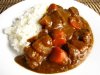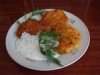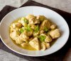 Для приготовления соуса, возьмите нарезанный на кубики и пассированный на сливочном масле лук, посыпьте порошком карри, добавьте в него яблочно -банановую смесь и прожарьте 2-3 минуты. После чего введите рыбный бульон и пиво, перемешайте и доведите до кипения.