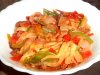 Кабачок и морковку нарезаем брусочками, лук – порей режем кольцами, если репчатый лук – полукольцами. Слегка обжариваем овощи в растительном масле. Добавляем зеленый горошек, обжариваем еще пять минут, присаливаем и снимаем с огня.