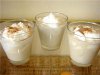 В отдельной посуде миксером на высокой скорости взбить сливки. Взбивать нужно до тех пор пока сливки не станут пышными, воздушными. Осторожно добавить часть взбитых сливок к йогуртовой смеси, размешать. Разлить напиток по бокалам или по креманкам, сверху выложить оставшиеся сливки, посыпать измельченными миндальными орешками (можно посыпать тертым шоколадом или какао).