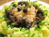 Картофель отварить в мундире, остудить, очистить, нарезать кубиками. Смешать фасоль, картофель, грибы с луком, добавить нарезанные кубиками маринованные огурцы, посолить и поперчить по вкусу, посыпать мелко нарезанным зеленым луком и заправить ароматным растительным маслом.