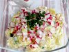 Базилик и зелень мелко нарезать. Смешать все компоненты салата, полить заправкой, перемешать. Посолить и поперчить по вкусу. Несколько редисок нарезать кружочками, украсить салат и подавать к столу.