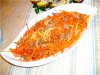 Сладкий перец, очистить и порезать соломкой, потом обжарить его пару минут на масле и положить в салатник.
