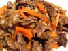 В сковородке разогреваем растительное масло. Нарезаем лук полукольцами, режем ломтиками чеснок, обжариваем до прозрачного цвета. Мясо достаем из маринада (или вилкой или ложкой с дырочками, шумовкой) и выкладываем к луку. Перемешиваем, обжариваем до мягкости. Потом выливаем маринад и тушим под крышкой до готовности. Если вам не нужна подливка, в конце приготовления крышку снимите и выпарите жидкость. Не забудьте подсолить по вкусу. Приятного аппетита!