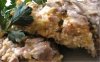 Подготовить форму прямоугольную. Класть сначала фарш, затем выложить грибы и опять фарш, после этого положить тонкие пластиночки сыра и опять выложить фарш. Сверху положить перец, порезанный на дольки.