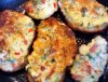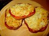Батон нарезаем тонкими ломтиками, одну сторону смазываем тонким слоем масла (совсем немного, только чтобы масло впиталось в хлеб) и этой стороной укладываем на противень. Сверху каждый ломтик смазываем подготовленной бутербродной массой и ставим в духовку. Готовим на среднем огне до подрумянивания нижней стороны ломтиков.