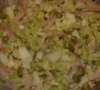 Горошек надо выложить из банки, рассол оставить. Лук очистить и нарезать мелкими кубиками. Яйца отварить и порезать мелко.