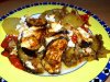 Овощи чистим, нарезаем картошку, лук, перец, баклажаны и кабачки кусками довольно крупно. Выкладываем на противень с бортиками или в форму для запекания. Поливаем маслом, посыпаем любимыми специями (очень хорошо идет орегано), перчим, солим и перемешиваем.