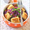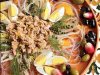 Для заправки смешайте оливковое или растительное масло с лимонным соком или с яблочным уксусом и слегка взбейте вилочкой. Полейте заправкой салат и сразу же подавайте к столу. Можно заправку подать и отдельно, в соуснике, тогда каждый ваш гость сможет регулировать вкус и остроту салата.