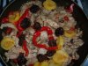 1. Мясо тщательно промойте, удалите плёнки, обсушите, нарежьте кубиками, посолите, поперчите, слегка обжарьте вместе с мелко нарезанным репчатым луком в растительном масле.