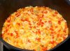 Сначала приготовьте заливку. Для этого нужно нарезать полукольцами лук и обжарить его в небольшом количестве растительного масла минут пять. Потом положит морковку (ее натереть на крупной терке), нарезанные ломтиками шампиньоны, помидоры (натереть на терке) и немного потушить. Всыпать муку, немного обжарить. Влить два стакана воды, когда закипит – положить сметану, посолить и поперчить, приправить специями.