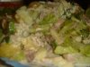 Мясо отварить до готовности, остудить и нарезать небольшими кусочками. Если не любите вареное мясо – можете слегка обжарить свинину до легкой румяной корочки. Чтобы салат не получился излишне жирным, обжаренное мясо выложите на салфетку – пусть жир впитается.