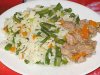 Фасоль разрезать небольшими кусочками, пробланшировать две – три минуты. Морковку отварить на пару почти до готовности. очистить, разрезать вдоль на тонкие длинные брусочки.