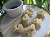 Смазываем смесью из крахмала и воды края вонтончиков. Собираем тесто, так чтобы получился узелок.