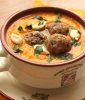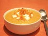 Вторую половину смеси взбиваем с яблочным соком. Вливаем в суп, прогреваем, но не кипятим. Добавляем молоко, нагреваем до кипения, но не кипятим. Разливаем супчик по тарелочкам, приправляем паприкой.