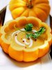 Луково – яблочную смесь делим на две половинки. Одну половину выкладываем в кастрюлю, заливаем пятью стаканчиками ранее приготовленного бульона, кладем пюре из тыквы и варим, помешивая, 10 мин.