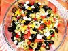 Готовый картофель остудить, очистить от кожуры и нарезать тонкими кружочками. Мелко порубить петрушку, помидоры нарезать колечками, сыр – кубиками. Маслины или оливки можно оставить целыми или нарезать кружочками – как вам больше нравится. Смешать все ингредиенты, по желанию можно полить оливковым маслом. Посолить и поперчить по вкусу, приправить специями. Заправить томатным соусом, посыпать зеленью и кедровыми орешками, перемешать. Салату нужно настояться около часа при комнатной температуре, поэтому его нужно готовить заранее.