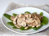 Лук режем тонкими полукольцами, грибы – ломтиками. На среднем огне обжариваем лук и грибы до слегка золотистого цвета. Если используете свежий шпинат, то в конце приготовления грибов добавьте его в сковородку чтобы он прогрелся и стал мягким. Если шпинат замороженный, то его достаточно только разморозить и отжать лишнюю жидкость.