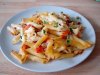 Колбаски слегка обжариваем, нарезаем кусочками. Фасоль режем наискосок (если замороженная – размораживаем), баклажаны и помидоры режем кубиками, лук – полукольцами. Рубим чеснок и зелень. Болгарский перец запекаем в духовке, снимаем кожицу, мякоть режем полосками.
