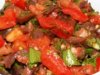 Нарезать перец на 4 части и положить между баклажанами и поверх них. Помидоры нарезать на половинки и положить поверх баклажанов и перцев. Посыпать овощи солью и сахаром. Крышку прикрыть и выставить слабый огонь. Как только появится пар из-под крышки пар, надо тушить еще около 25 минут. После этого надо проверить на готовность баклажаны, если еще они не совсем готовы, то тушить еще минуток десять.