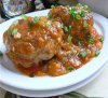Пока обжариваются тефтели, приготовим соус. Баклажаны нужно наколоть вилочкой, вместе с перцем выложить на противень и запечь в духовке при температуре 200 градусов. Перец запекается 20 минут, баклажаны – 40. Готовые овощи положить на несколько минут в миску и накрыть ее – тогда будет легче снять с овощей кожицу. Очистить овощи от кожицы (перец еще и от семян), вместе с помидорами измельчить в блендере. Посолить и поперчить по вкусу. Залить соусом тефтели, накрыть сковородку крышкой и тушить на слабом огне 10-15 минут. Готовые тефтели посыпать зеленью. Приятного аппетита!