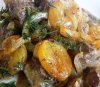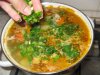 Для приготовления этого блюда необходимо нарезать мясо кусочками примерно в 40 граммов. Лук очистить и порезать полукольцами, нарезать необходимо тонко. Лук надо выложить в отдельную миску. Туда же положить нарезанную зелень. Перемешать, присолить и добавить все необходимые специи. Перемешать.