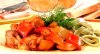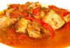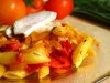 Пока готовится мясо, мелко нарезать лук и чеснок, перцы нарезать кубиками. Разогреть в другой сковородке или в сотейнике оставшееся масло, обжарить до прозрачности лук и чеснок. Минут через пять добавить кусочки перца, готовить еще пять минут. Влить 220 мл. кипятка, дать снова закипеть и выложить к овощам кусочки мяса.